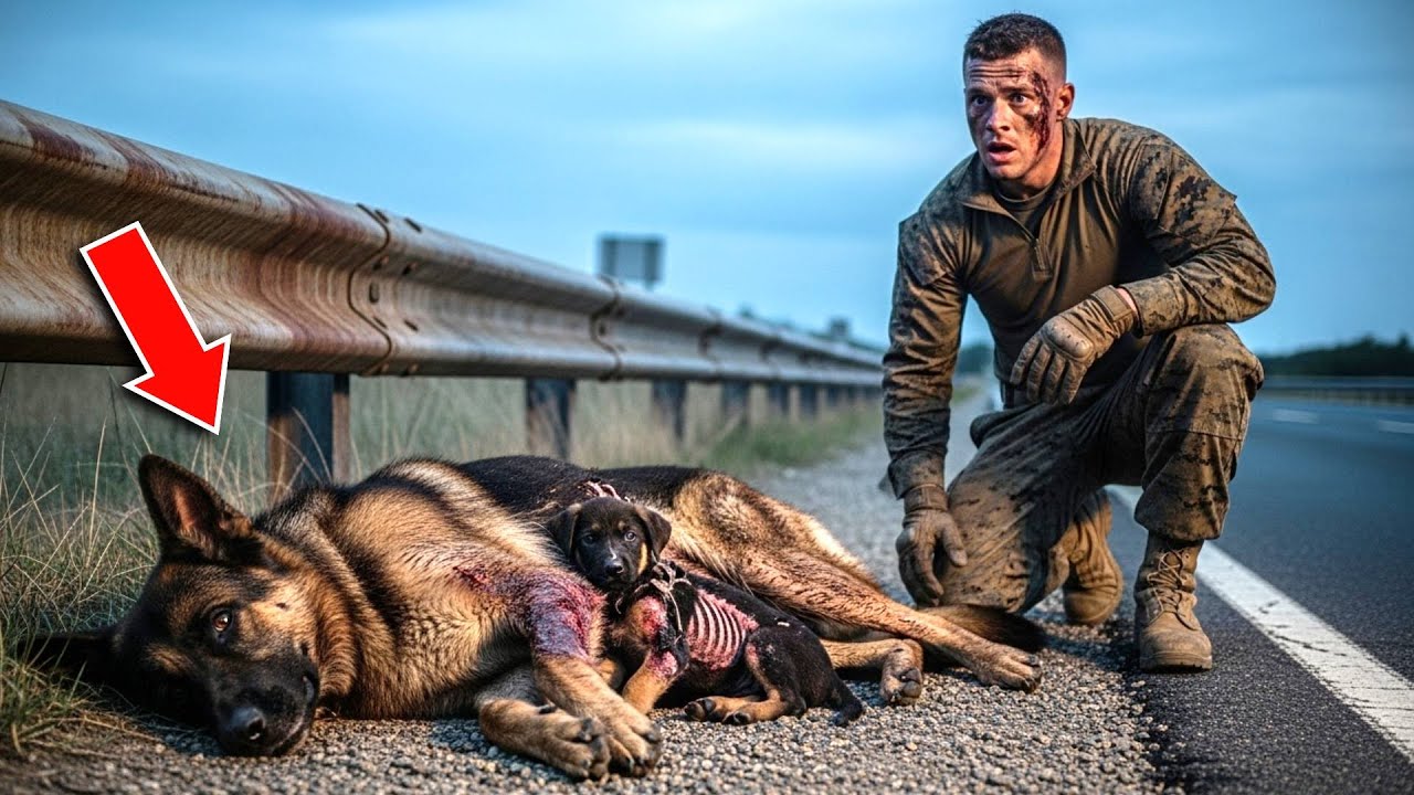 German Shepherd and Her Pup Left on the Road—But a U.S. Marine and K9 Uncovered…